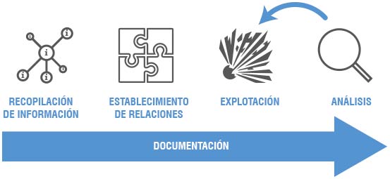 Tras las fases de recopilación de información y establecimiento de relaciones, las fases de explotación y análisis, se realizan dentro de un proceso iterativo consistente por un lado en ejecutar las pruebas de explotación y por otro analizar los resultados obtenidos para modificar aspectos concretos en aquellas pruebas cuyo resultado no ha sido exitoso.